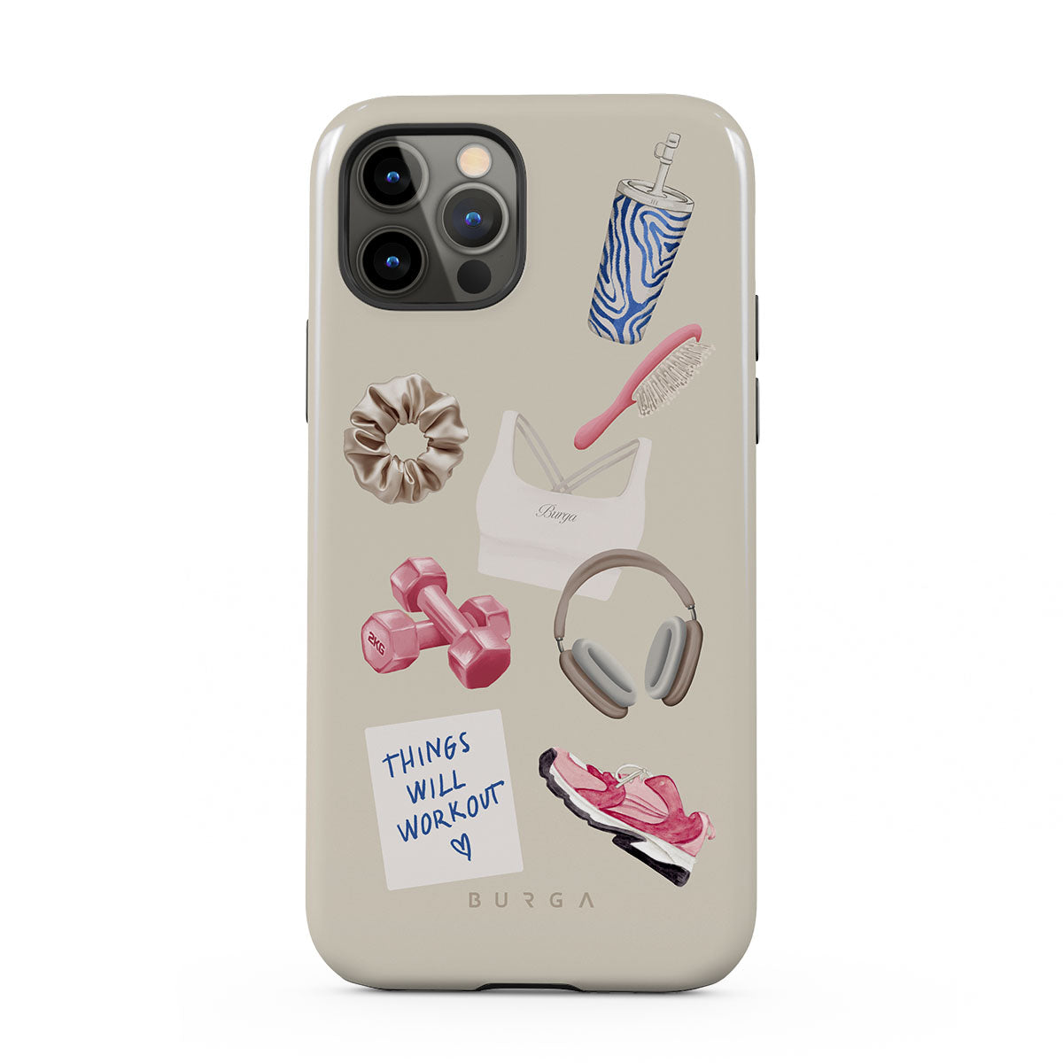 This design features: dumbbells, headphones, tumbler, hairbrush, pink trainers, sports bra, crunchie, "Things Will Work Out" sticky note