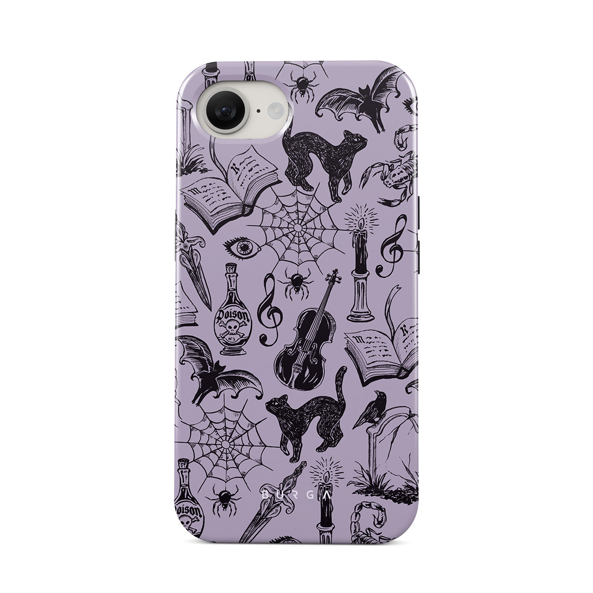 This design features: gothic doodles, mystical elements, spiders, spiderweb, cat, violin, eye, candle, dagger, book, bat, crow, scorpion