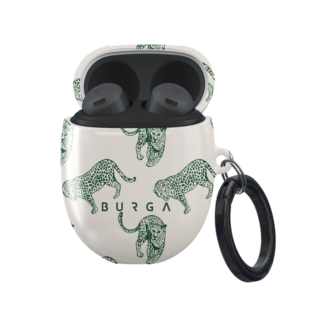 Our Antique Google Pixel Buds Pro case cover designa nude canvas kissed by refined green contours, painting an eternal saga of elegance. Enthroned at its center is a regal leopard embraced by a tender floral caress. A nod to timeless opulence, this design captures the essence of vintage prestige.