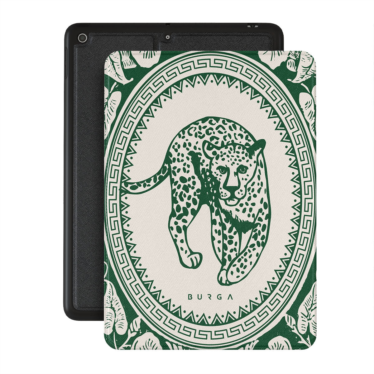 Our Antique iPad 10.2 (9th/8th/7th Gen) folio case designa nude canvas kissed by refined green contours, painting an eternal saga of elegance. Enthroned at its center is a regal leopard embraced by a tender floral caress. A nod to timeless opulence, this design captures the essence of vintage prestige.