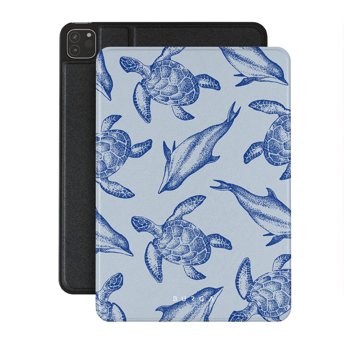 A beautiful design featuring lively turtles and dolphins playfully dancing in serene light blue water. Dive into the ocean's rhythm with our Aquatic Dance iPad Pro 11 (2nd/1st Gen) folio case.