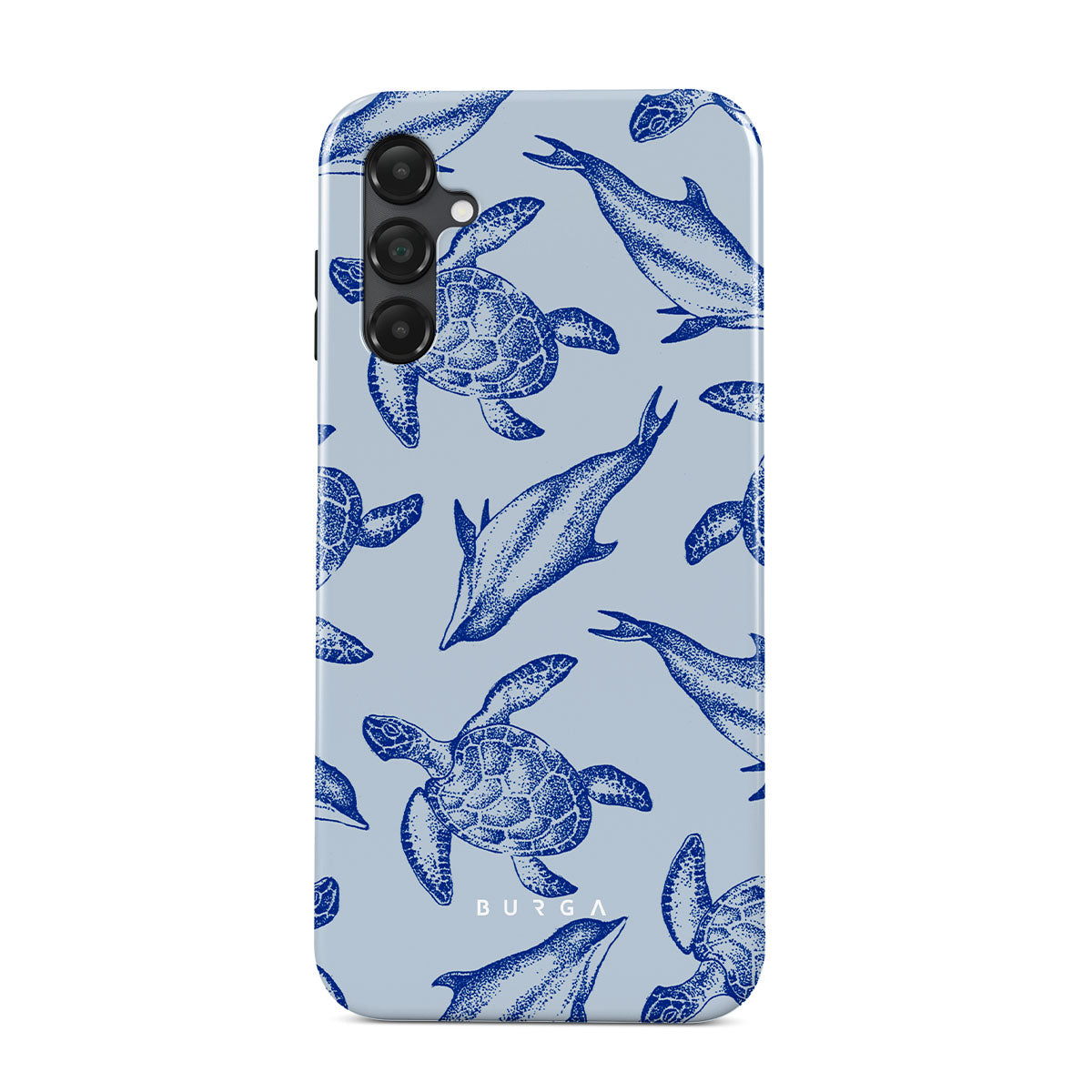 A beautiful design featuring lively turtles and dolphins playfully dancing in serene light blue water. Dive into the ocean's rhythm with our Aquatic Dance Samsung Galaxy A25 case.