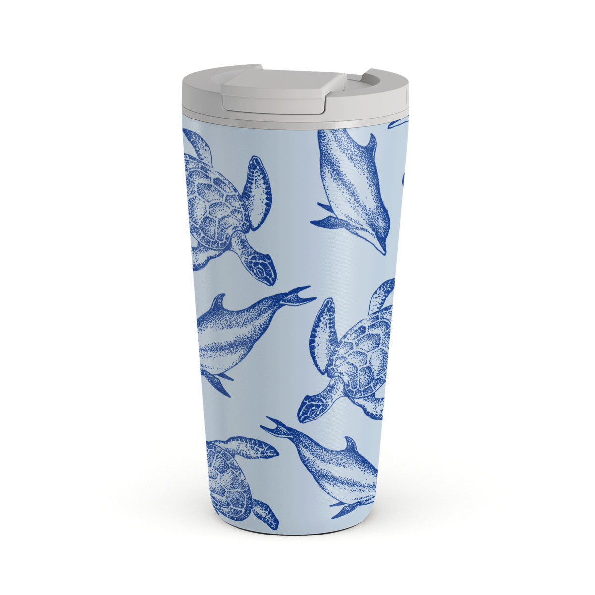 This design features: turtle, dolphins.