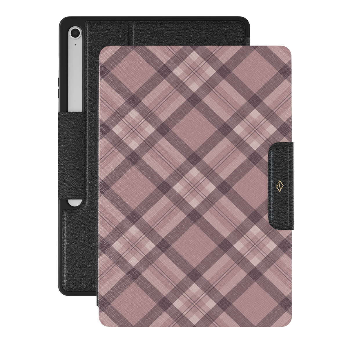 Made for those who hustle hard and look sharp. Our ASAP Samsung Galaxy Tab S10+ FE folio case design features a sleek rosé-gray background with diagonal plaid in soft grey and deep pink—mixing modern flair with understated elegance. For the pros who know that style and speed go hand-in-hand.