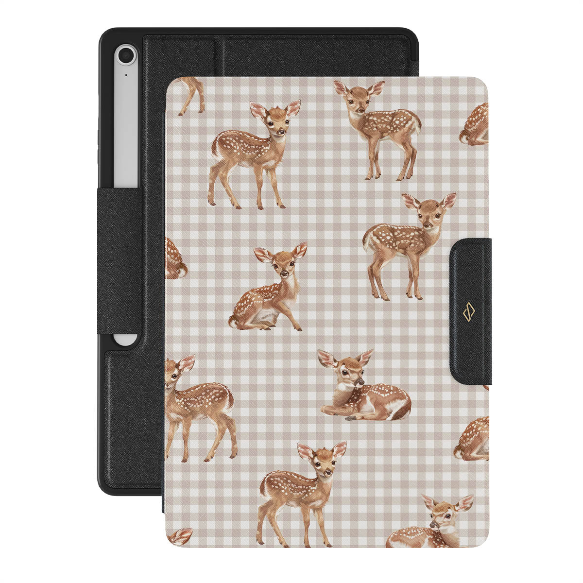 Gentle deers, frozen in time on a field of nostalgia, invite you to rediscover the playful innocence of quiet afternoons in the shade of old trees. Meet our Bambi Samsung Galaxy Tab S10+ FE folio case design.