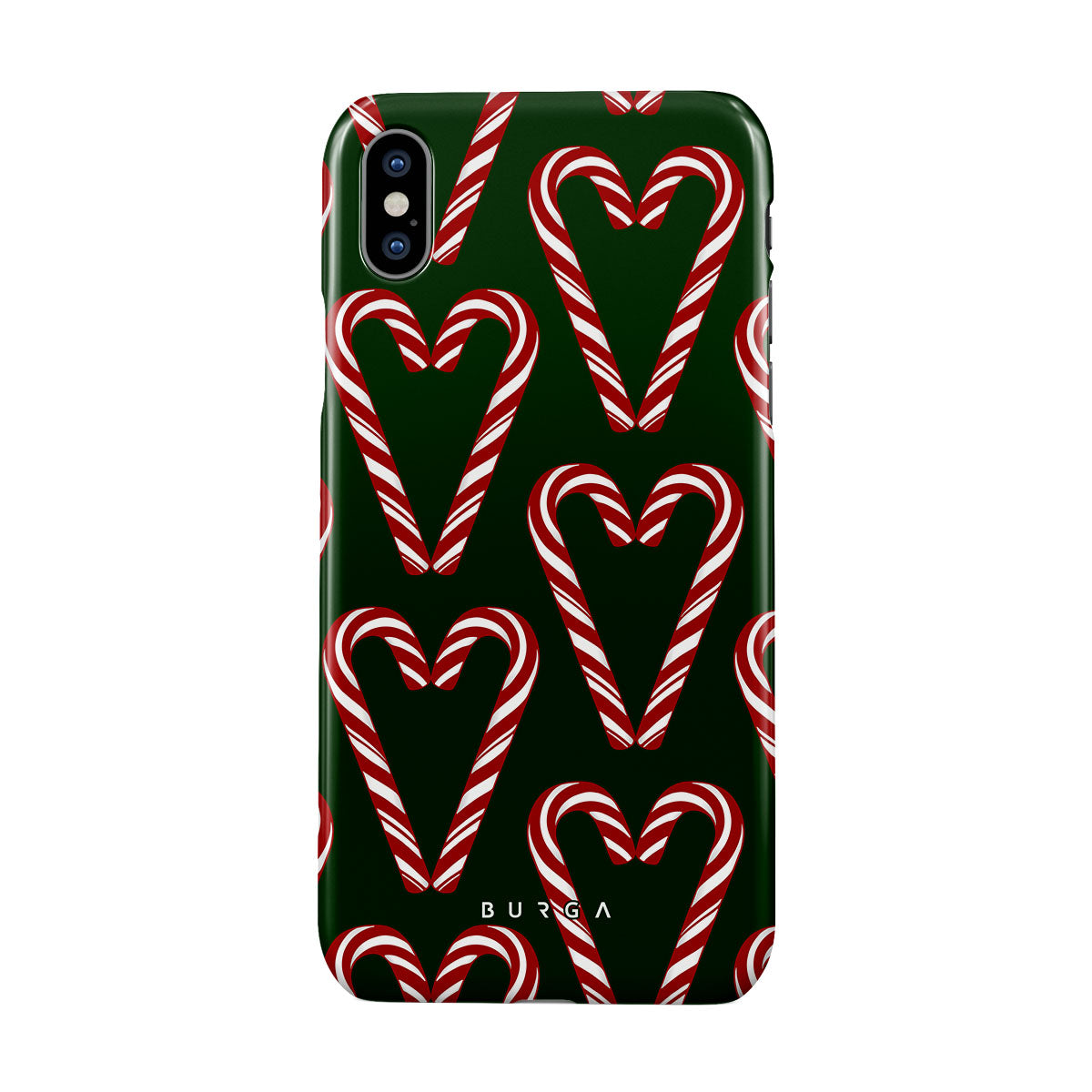 Vibrant and playful, our Candy Cane iPhone X / XS Case phone case design showcases candy cane heart motifs against a dark green background—a delightful choice for those who love a touch of whimsy and nostalgia.