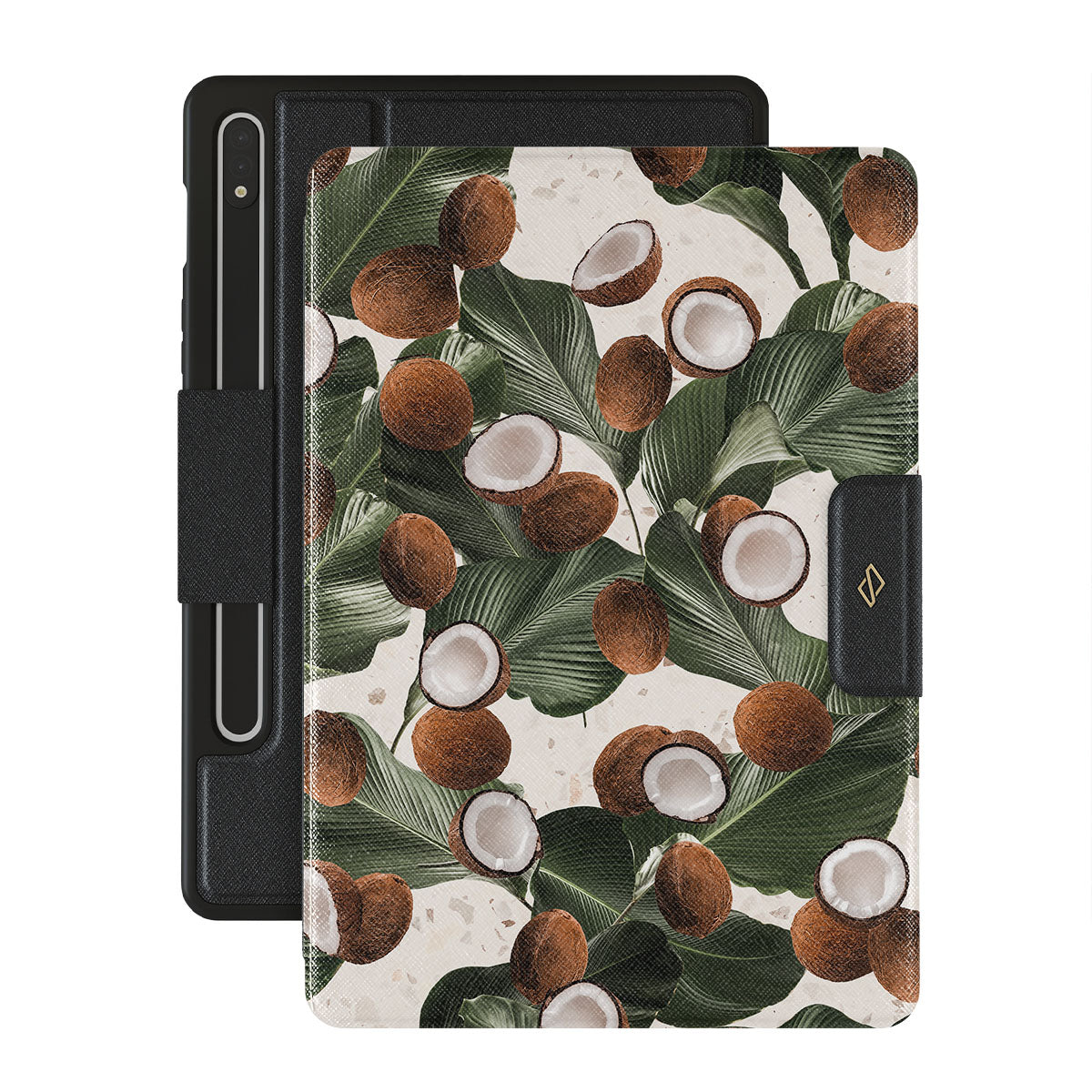 Coconut Crush Samsung Galaxy Tab S8/S7 folio case showcases a soft creme color design with a playful addition of coconuts on top. The unexpected design duo will add a touch of tropical playfulness to your style while offering heavy-duty protection for your cell Galaxy Tab.