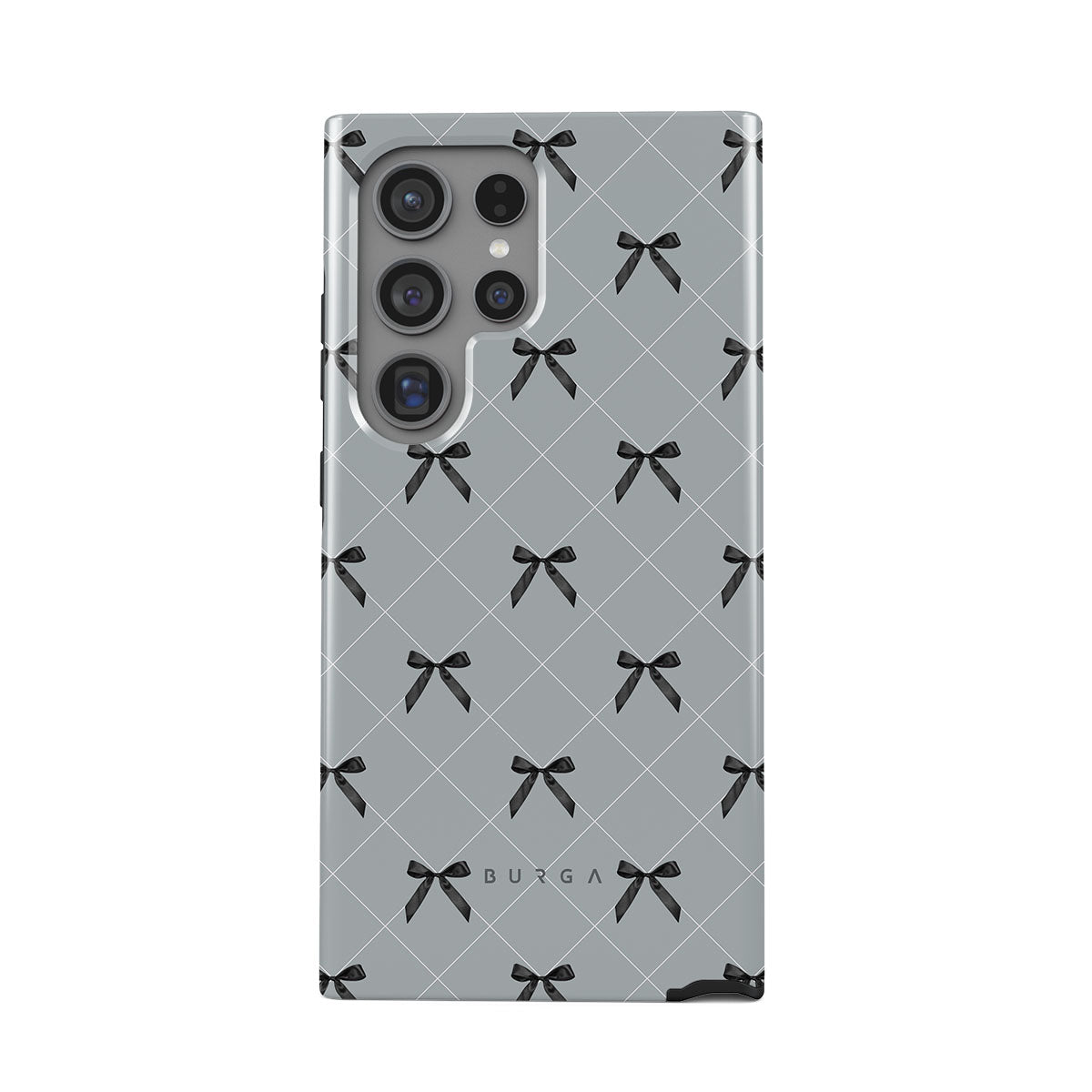 A subtle hint to a world of dance and soft melodies. Crisscrossing bows over a muted gray tone capture the flirtatious essence of the coquette-core aesthetic. Playful and sweet, our Coquette Samsung Galaxy S24 Ultra phone case design is perfect for those who find beauty in the details.