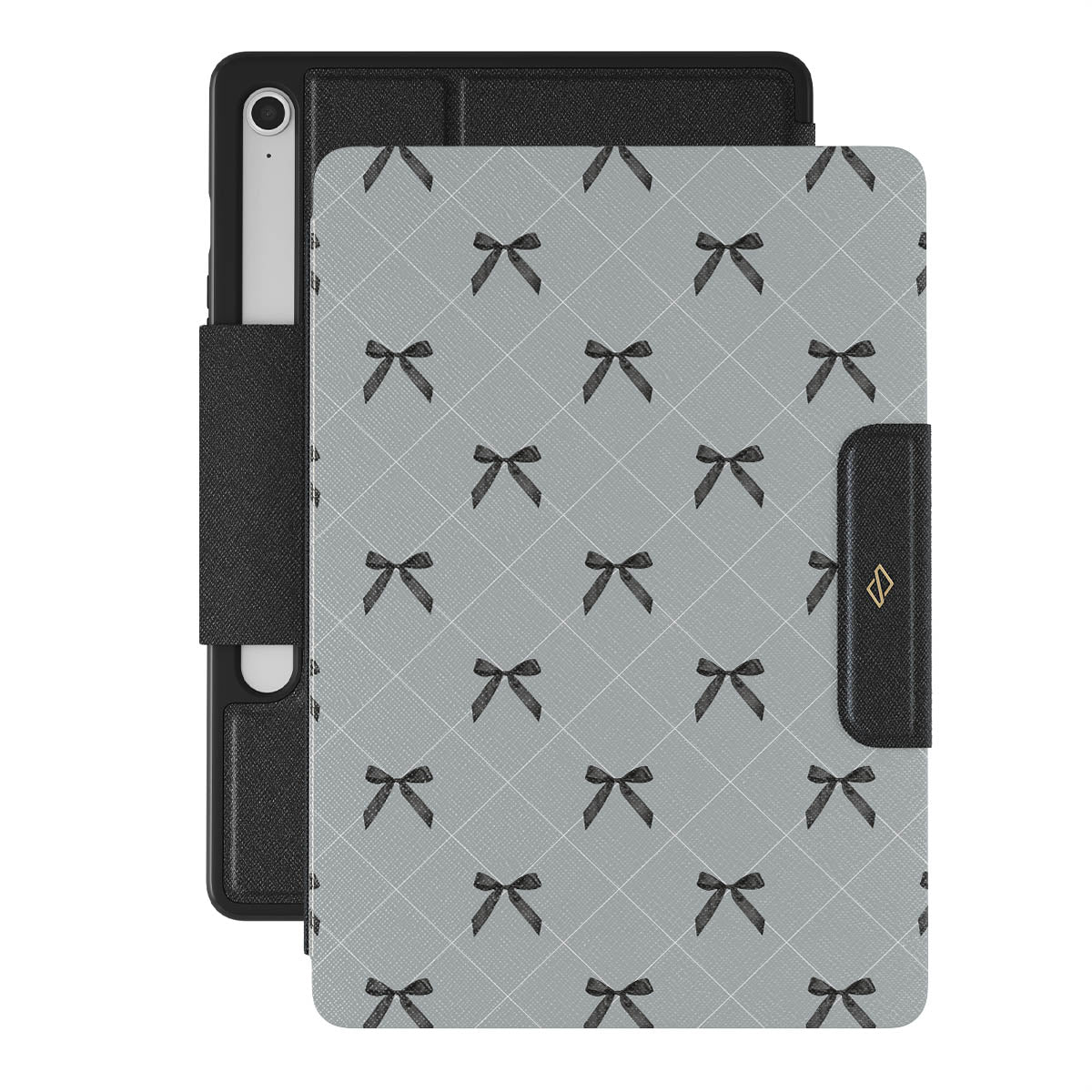 A subtle hint to a world of dance and soft melodies. Crisscrossing bows over a muted gray tone capture the flirtatious essence of the coquette-core aesthetic. Playful and sweet, our Coquette Samsung Galaxy Tab S10 FE folio case design is perfect for those who find beauty in the details.