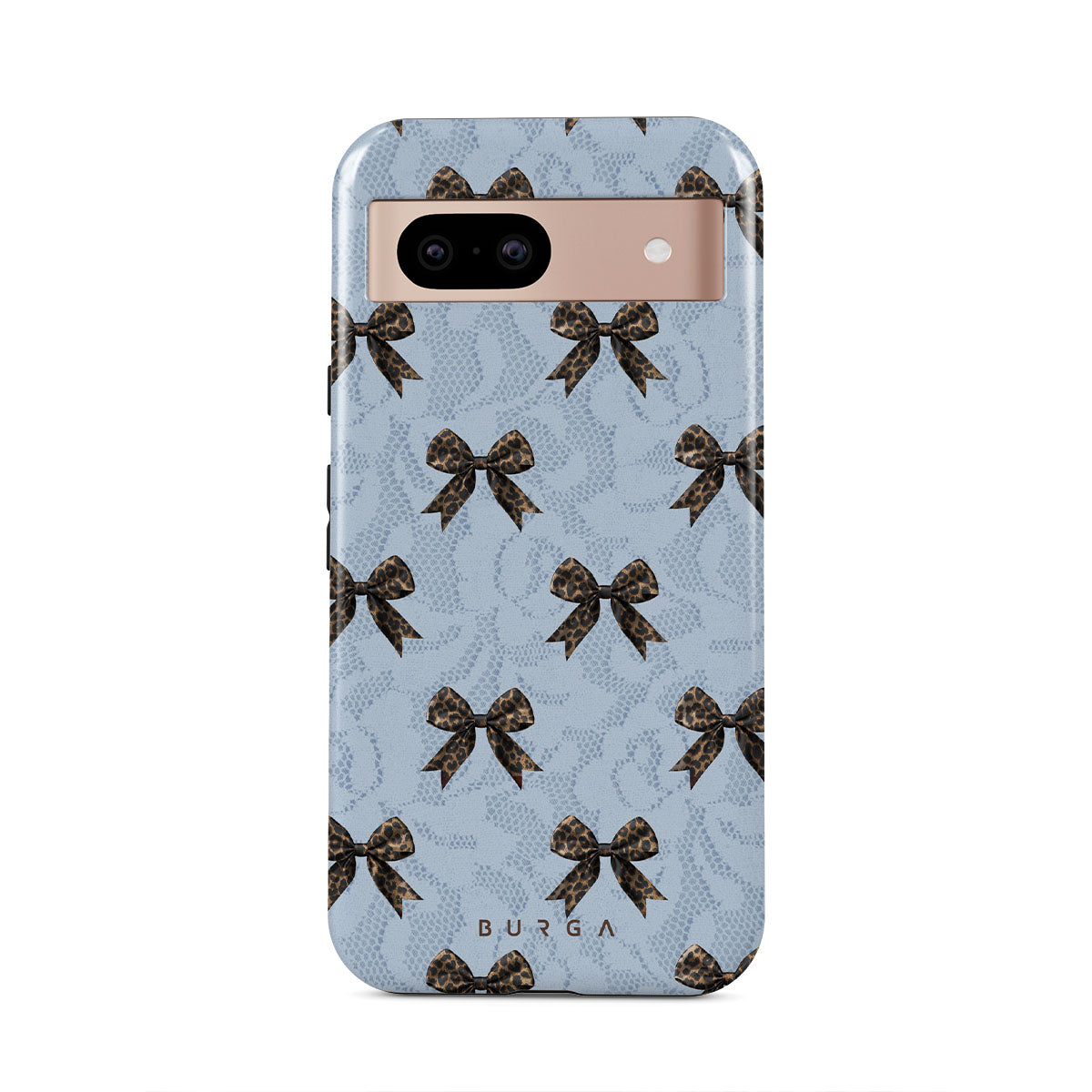 For those who command attention with subtle elegance, our Fashionista Google Pixel 8a phone case design is your go-to. A soft blue background, accented by dark grey bows and subtle lace patterns, exudes polished, effortless style. It's quiet confidence with a hint of charm.