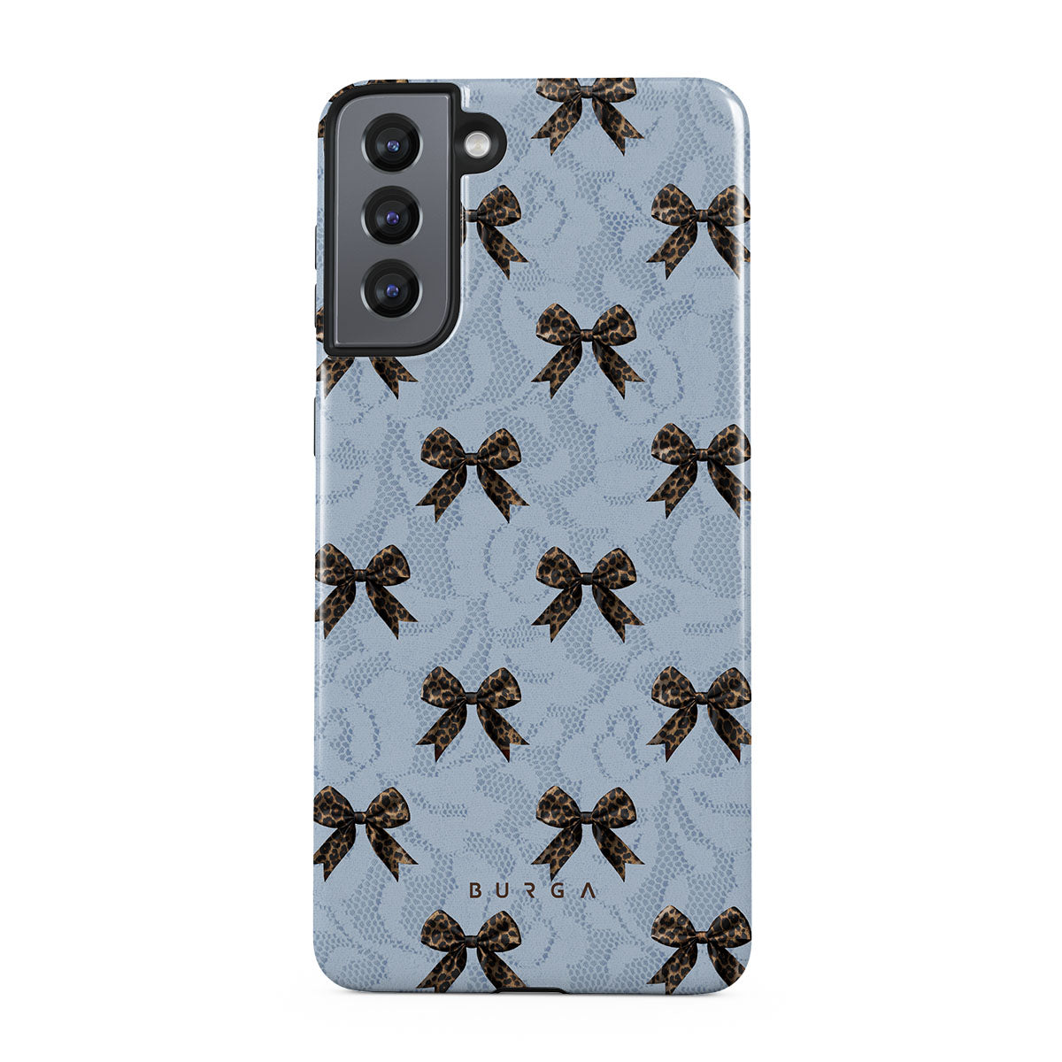 For those who command attention with subtle elegance, our Fashionista Samsung Galaxy S21 phone case design is your go-to. A soft blue background, accented by dark grey bows and subtle lace patterns, exudes polished, effortless style. It's quiet confidence with a hint of charm.
