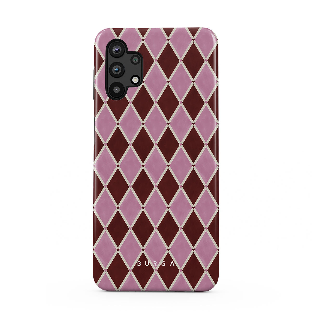 This design features: harlequin pattern, pink diamonds, deep red background
