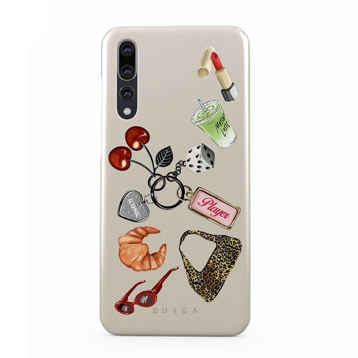 This design features: red sunglasses, red lipstick, green matcha drink, croissant, black dice, leopard-print bag, keychain with silver heart, cherries, dice and "Player" tag