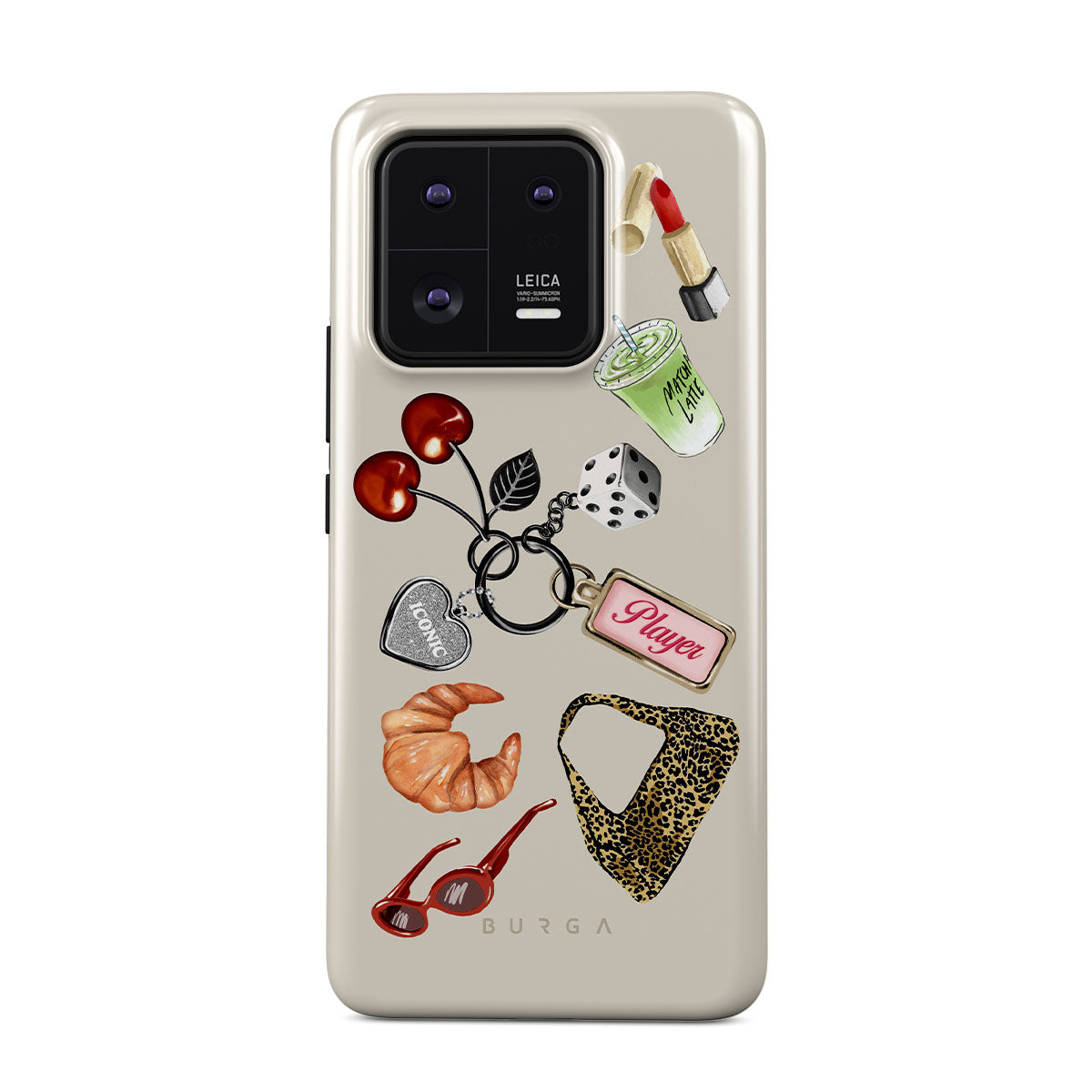 This design features: red sunglasses, red lipstick, green matcha drink, croissant, black dice, leopard-print bag, keychain with silver heart, cherries, dice and "Player" tag