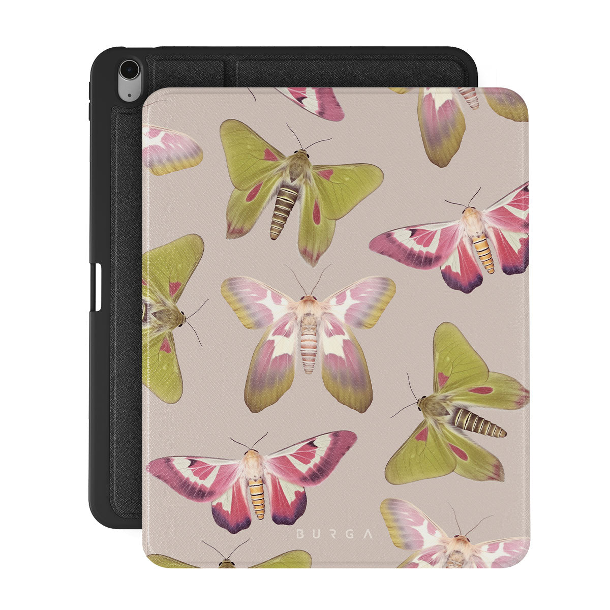 A tapestry of muted-toned moths — their wing patterns echoing tales of transformation and resilience found in nature's delicate beings. These moths, wings wide, serve as silent mentors, teaching us that every phase of life and change holds its own magic and mystery. Discover our Metamorphosis iPad Air 13 (7th/6th Gen) folio casedesign.