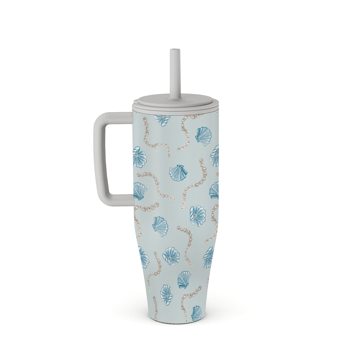 This design features: pearls, seashells, light blue background, marine elements