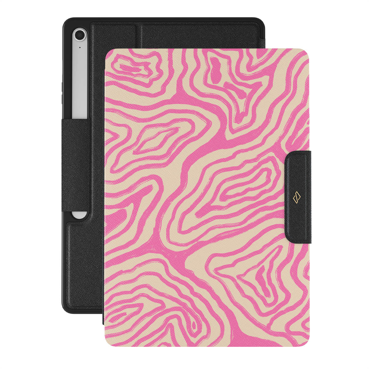 The Pink Shores Samsung Galaxy Tab S10+ FE folio case features mesmerizing pink swirls on a cream background. This vibrant, beach-insipired pattern captures the serene beauty of sandy beaches kissed by soft pink waves. Perfect for those who love unique, ocean-inspired aesthetics.