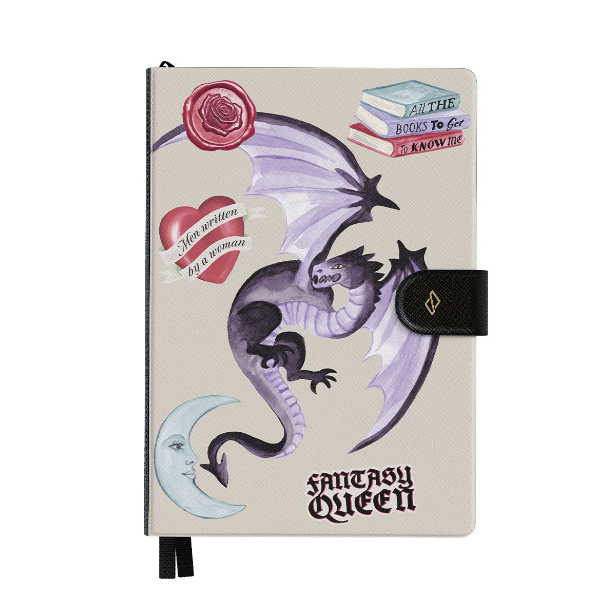 This design features: purple dragon, "Fantasy Queen" sticker, crescent moon, purple wax seal, heart with message, books