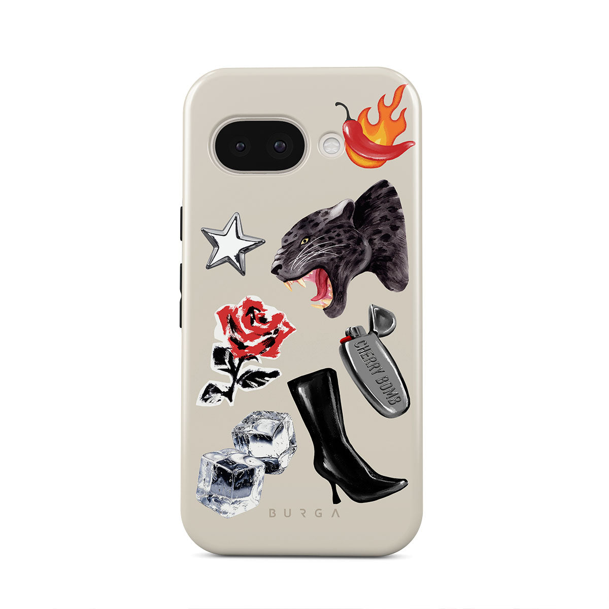 This design features: black panther, red rose, burning bell pepper, silver lighter, black knee-high boots, ice cubes, silver star