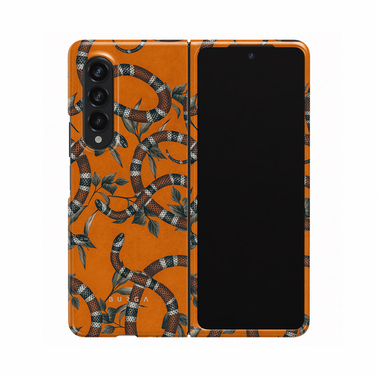 Take a bit of fierceness with yourself with our bright orange and dangerously beautiful Samsung Galaxy Z Fold 3 phone case with a snake pattern. This case is real eye candy for fashion lovers and just as needed for those who strive to keep their phones protected.