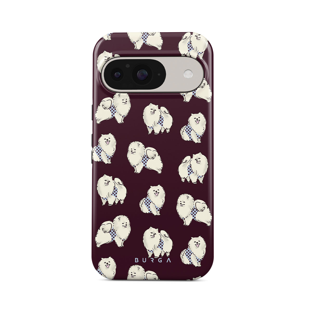 This design features: white fluffy dogs on a deep burgundy background, poodles, pets.