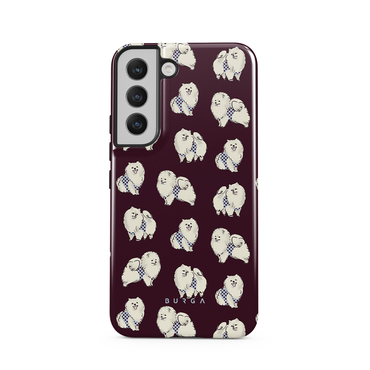 This design features: white fluffy dogs on a deep burgundy background, poodles, pets.