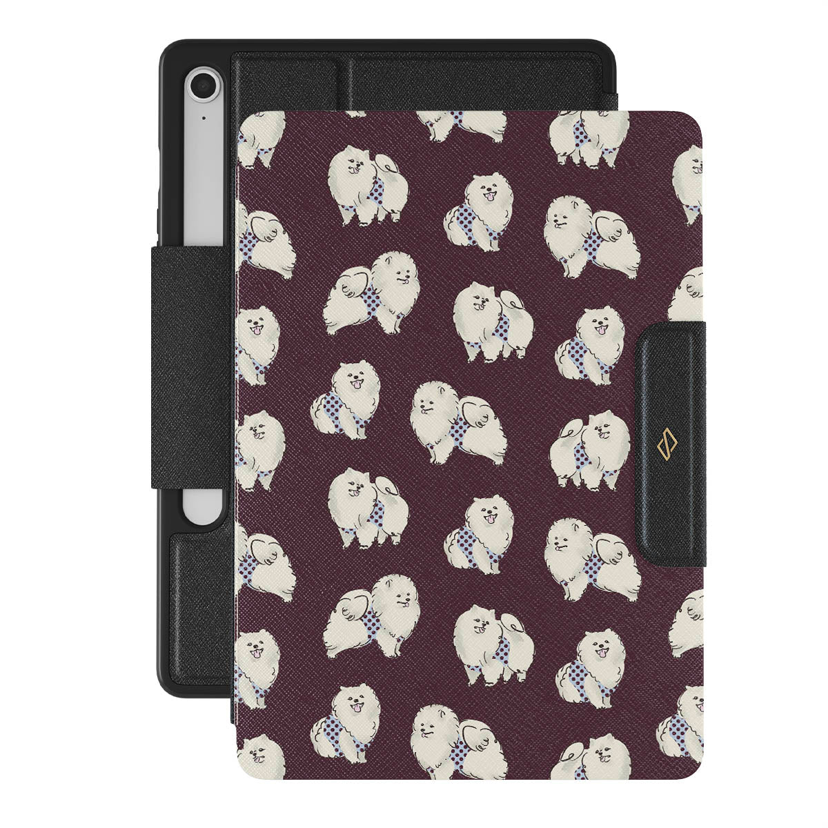 This design features: white fluffy dogs on a deep burgundy background, poodles, pets.