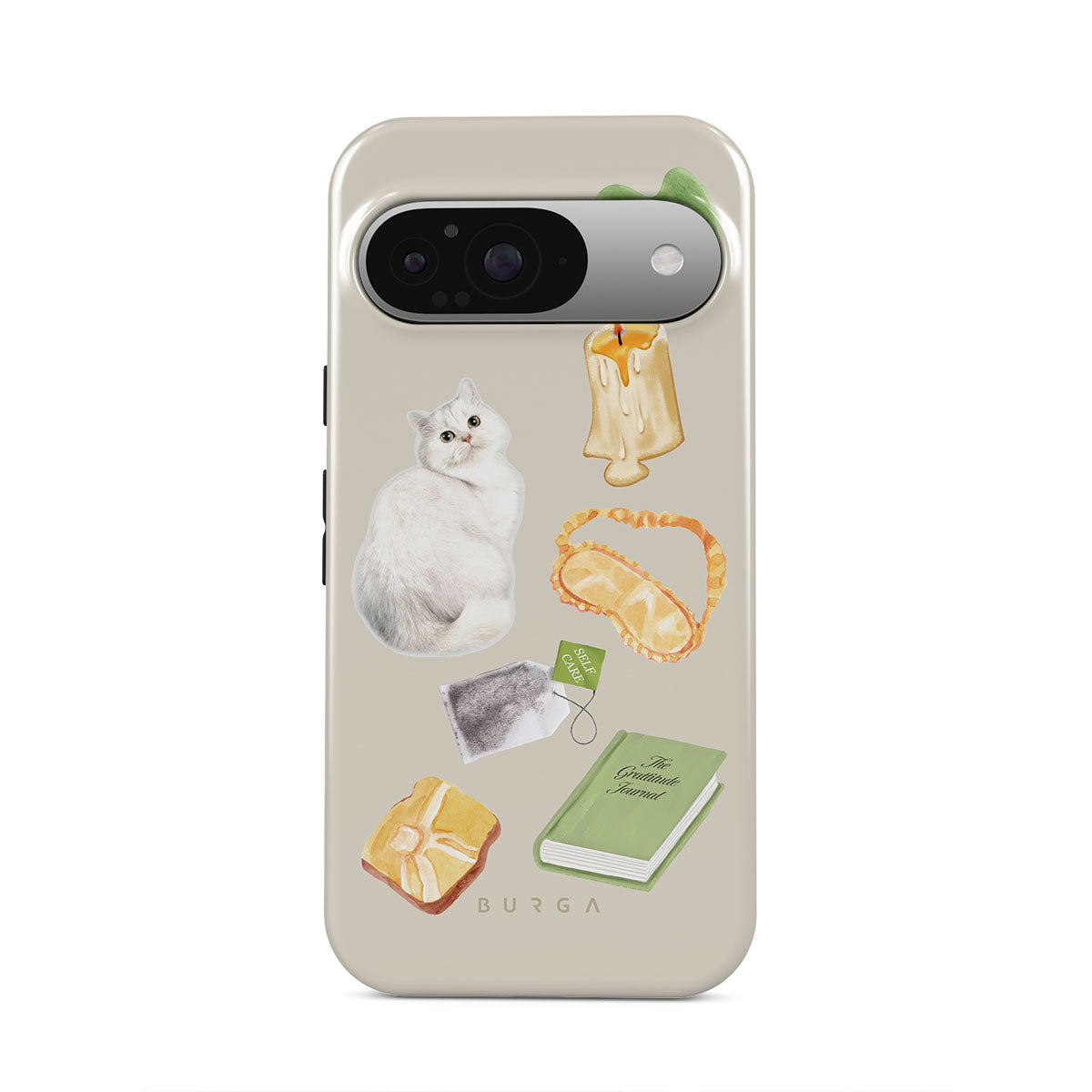 This design features: white cat, green book, candle, Gua Sha bar, sleeping mask, tea bag, yellow crystal