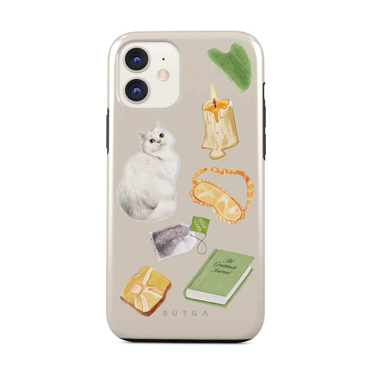 This design features: white cat, green book, candle, Gua Sha bar, sleeping mask, tea bag, yellow crystal