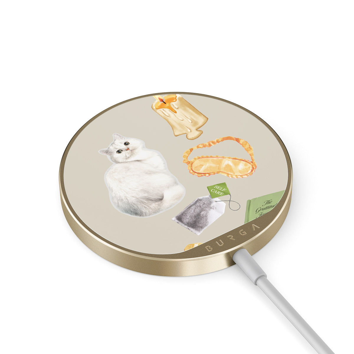 This design features: white cat, green book, candle, Gua Sha bar, sleeping mask, tea bag, yellow crystal