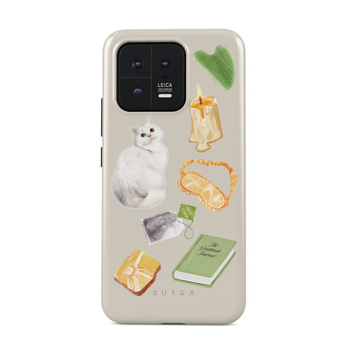 This design features: white cat, green book, candle, Gua Sha bar, sleeping mask, tea bag, yellow crystal