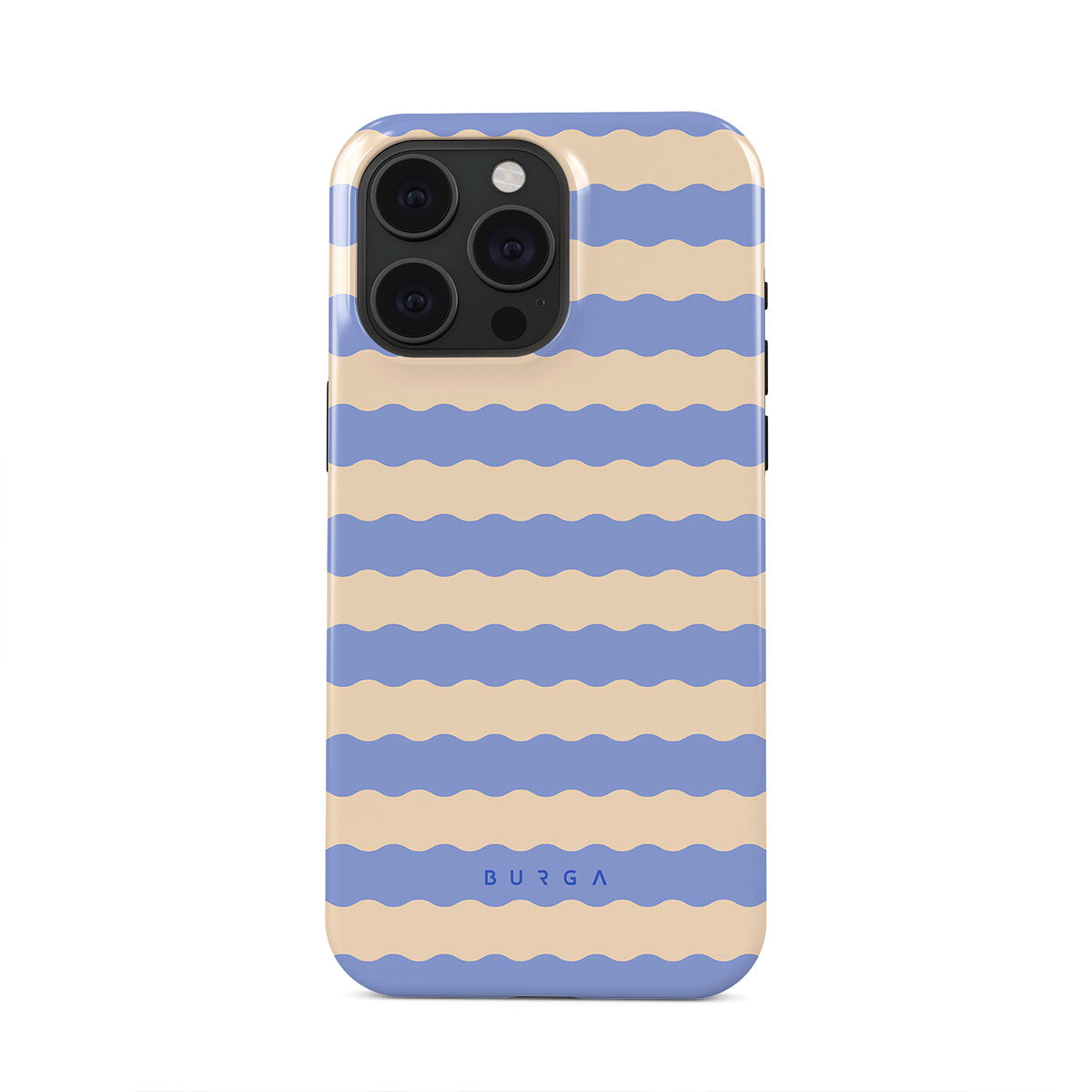 Dive into the cool, refreshing style of our Splash design–a dynamic iPhone 15 Pro Max phone case featuring playful, wavy stripes of serene ocean blue and soft sandy beige. Perfect for those who love to make a splash with their accessories.