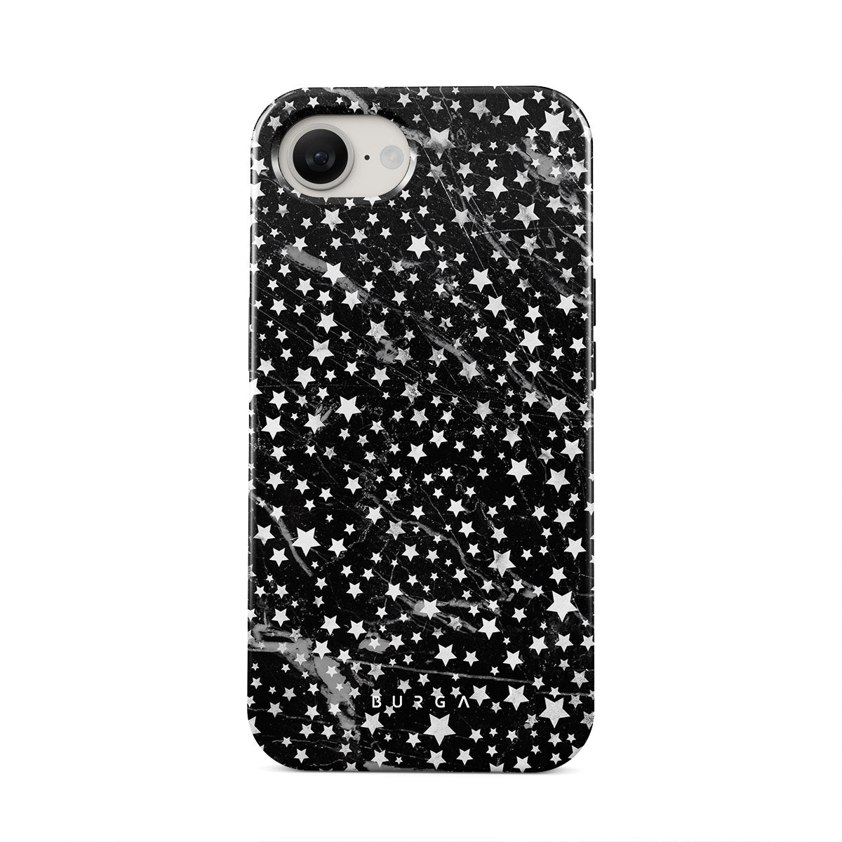 iPhone 16e phone case is inspired by the sky above us. Here the charming star pattern meets with a trendy black and white marble. Add the unique combination to your wardrobe and transform your protective phone case into a fashion accessory.