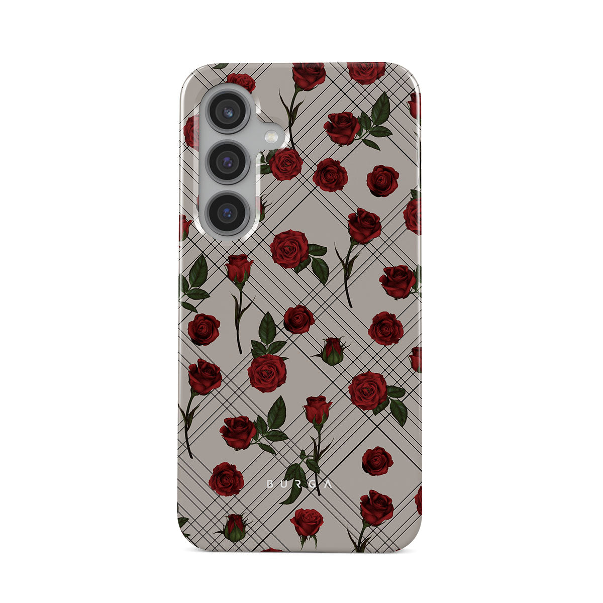 Embrace the subtle rebellion of our Sweet Sin Samsung Galaxy S24 Plus phone case design. On a muted nude-gray canvas, scattered small red roses hint at passions hidden beneath the surface. A design that balances the delicate with the daring. Crafted for those who find beauty in the unexpected and wear their edge with elegance.