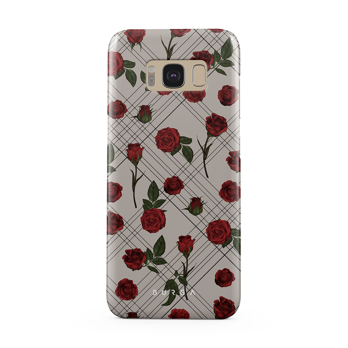 Embrace the subtle rebellion of our Sweet Sin Samsung Galaxy S8 phone case design. On a muted nude-gray canvas, scattered small red roses hint at passions hidden beneath the surface. A design that balances the delicate with the daring. Crafted for those who find beauty in the unexpected and wear their edge with elegance.