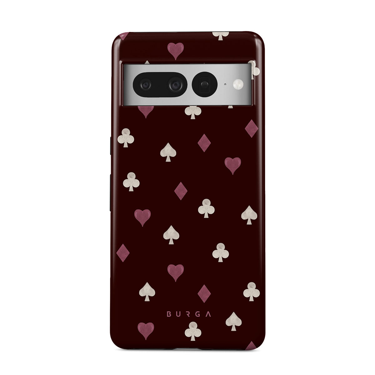 Nothing is as it appears. Hearts, clubs, diamonds, and spades—stacked in your favor or playing against you? This Google Pixel 7 Pro phone case design features a rich burgundy background and minimalist suits that make for a game where the rules are constantly shifting.
