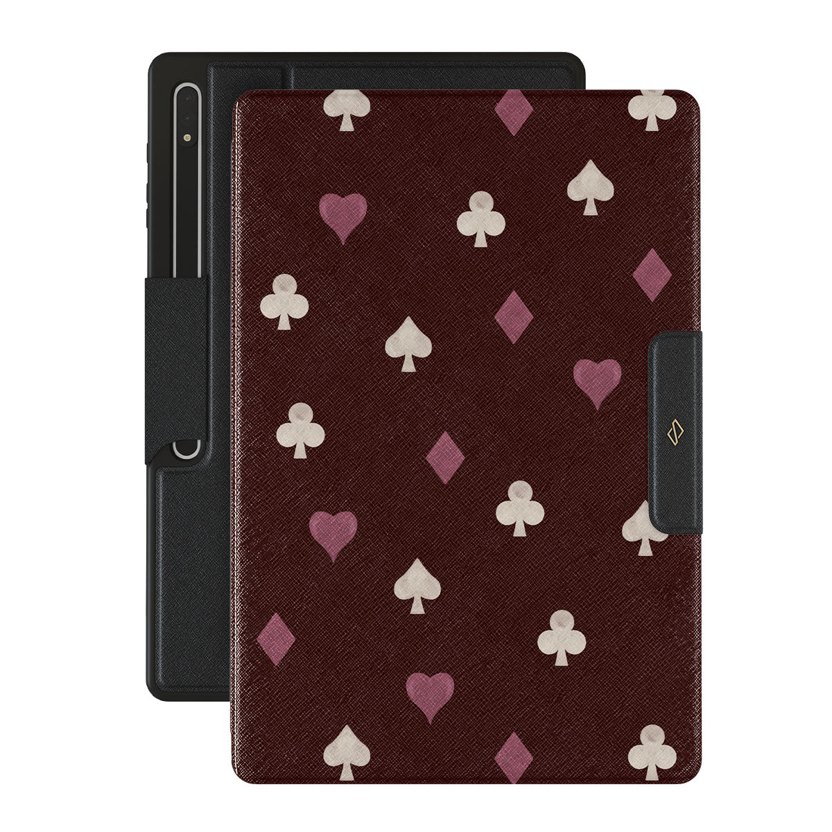 Nothing is as it appears. Hearts, clubs, diamonds, and spades—stacked in your favor or playing against you? This Samsung Galaxy Tab S10 Ultra folio case design features a rich burgundy background and minimalist suits that make for a game where the rules are constantly shifting.