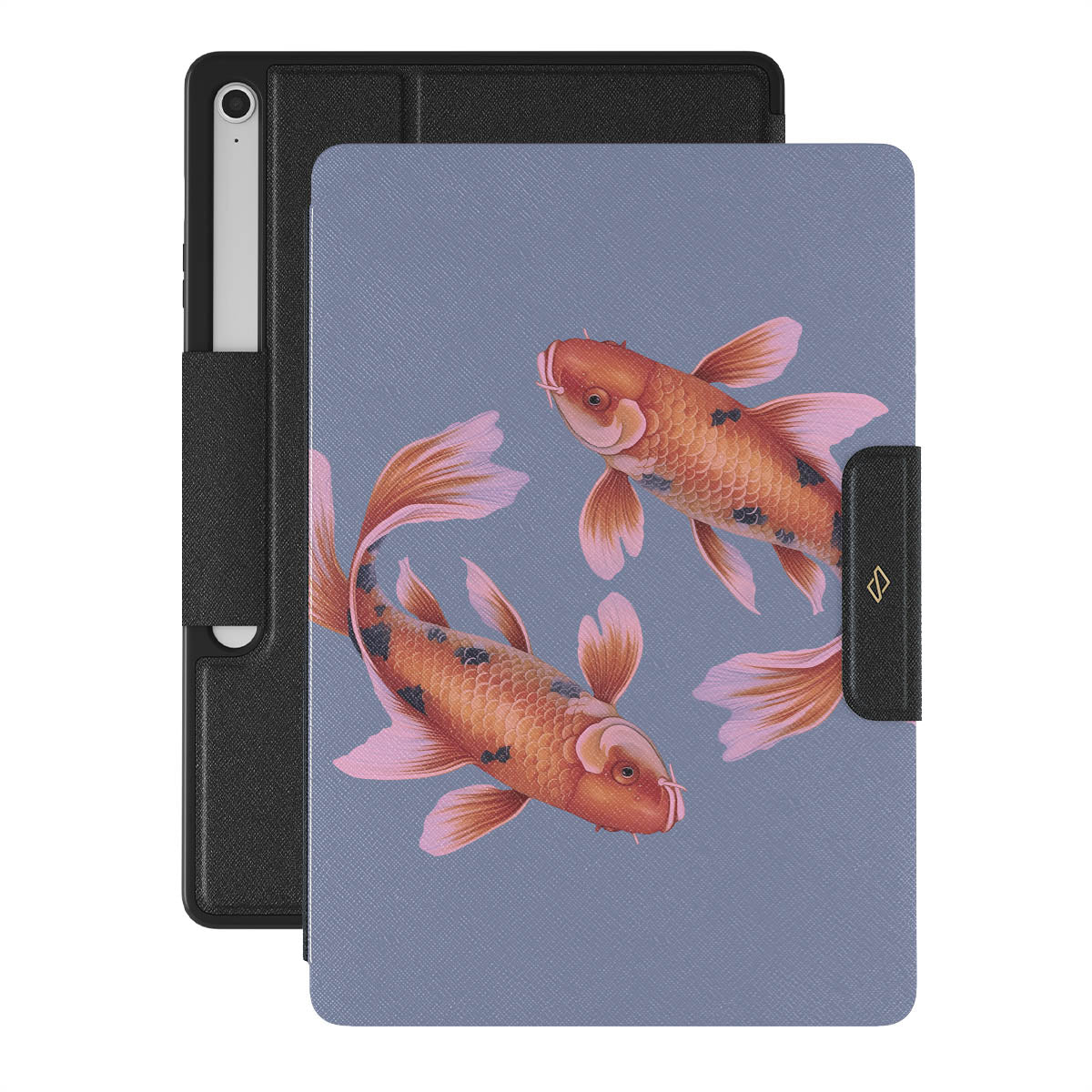 In the embrace of serene blue, the golden koi swirl, a symbol of life's fluid nature and the grace of going with the flow. Their dance is a serene meditation on the currents of destiny and the elegance of adapting with purpose. Discover our Zen Samsung Galaxy Tab S10+ FE folio case design.
